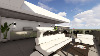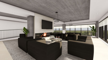 Lounge panoramique au 6ᵉ étage avec terrasse BBQ et foyer intérieur