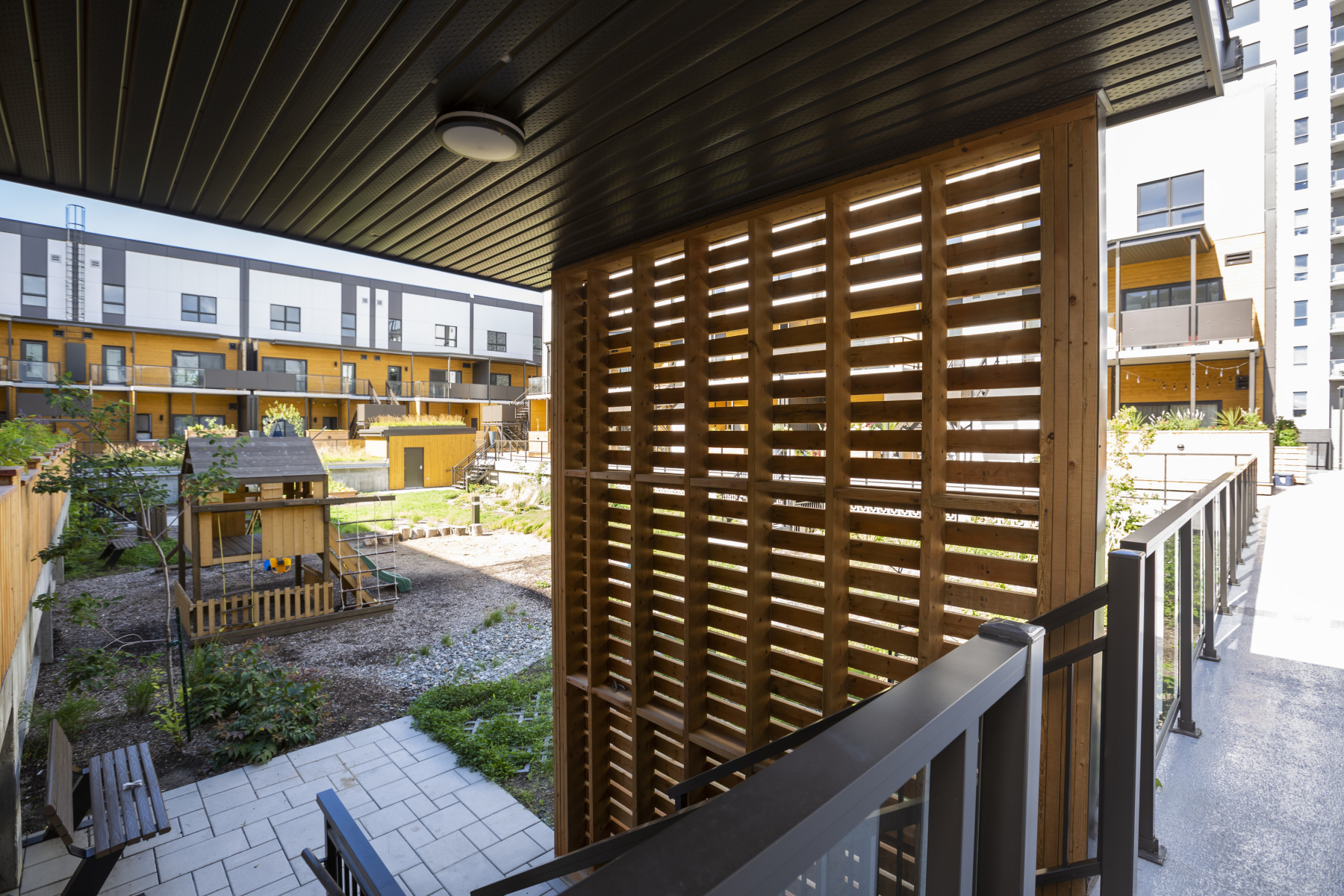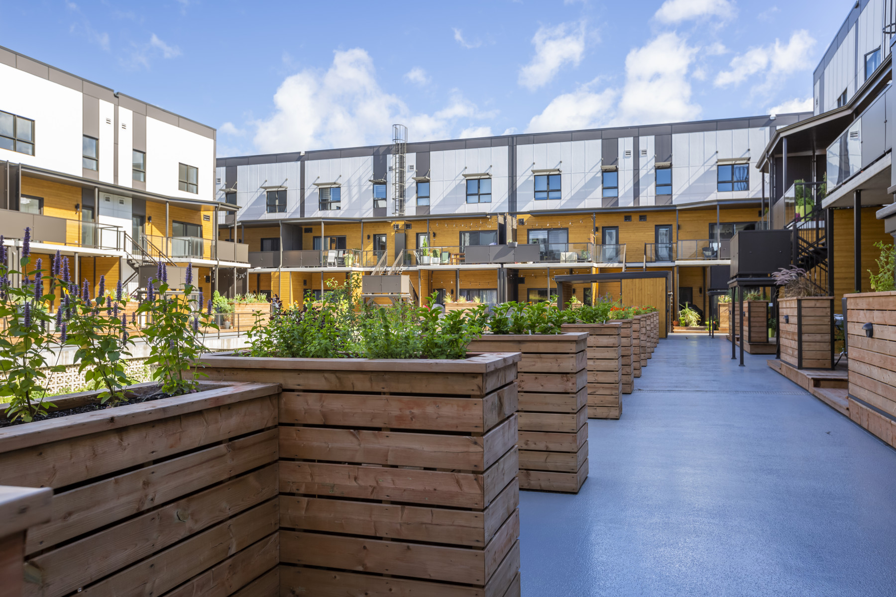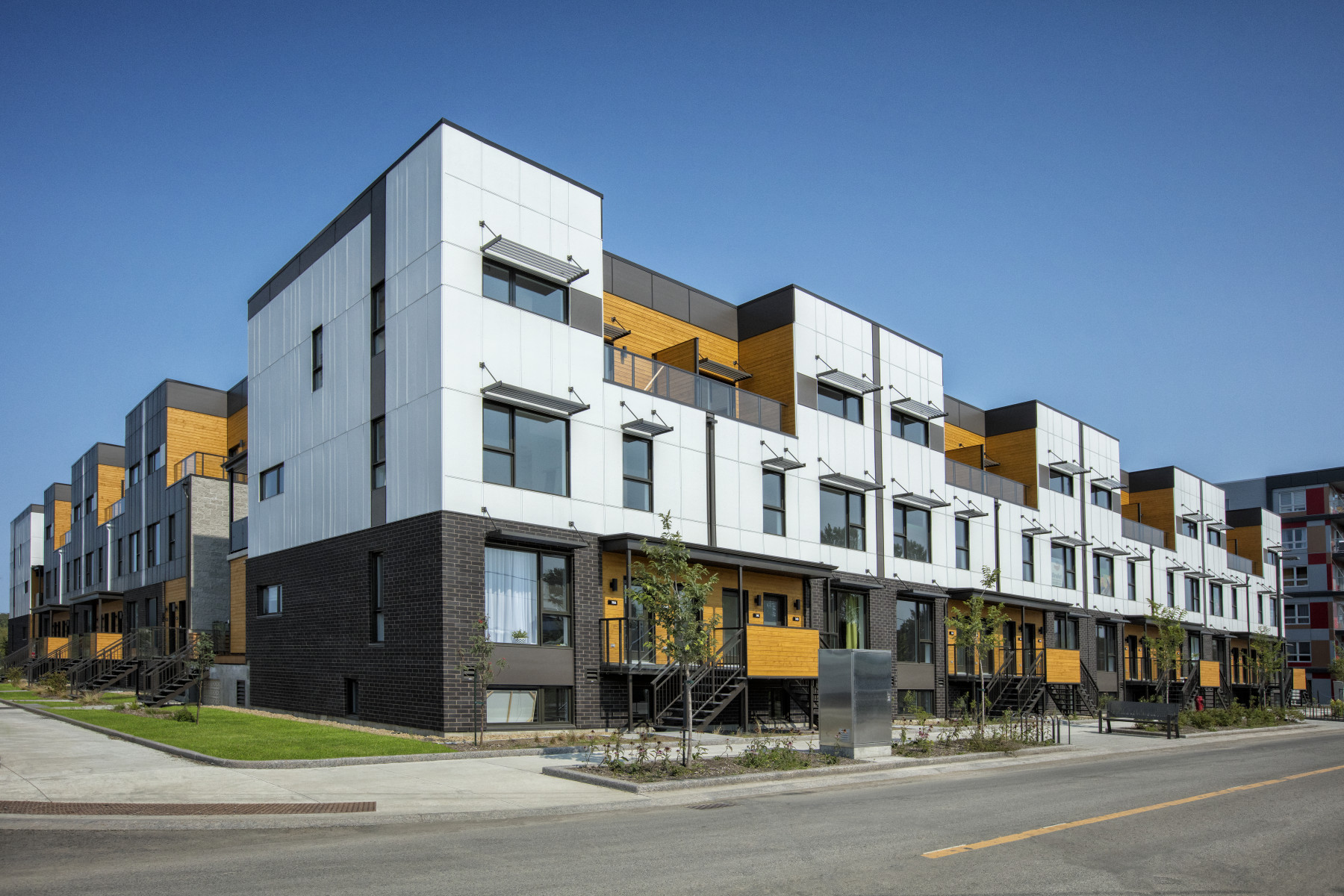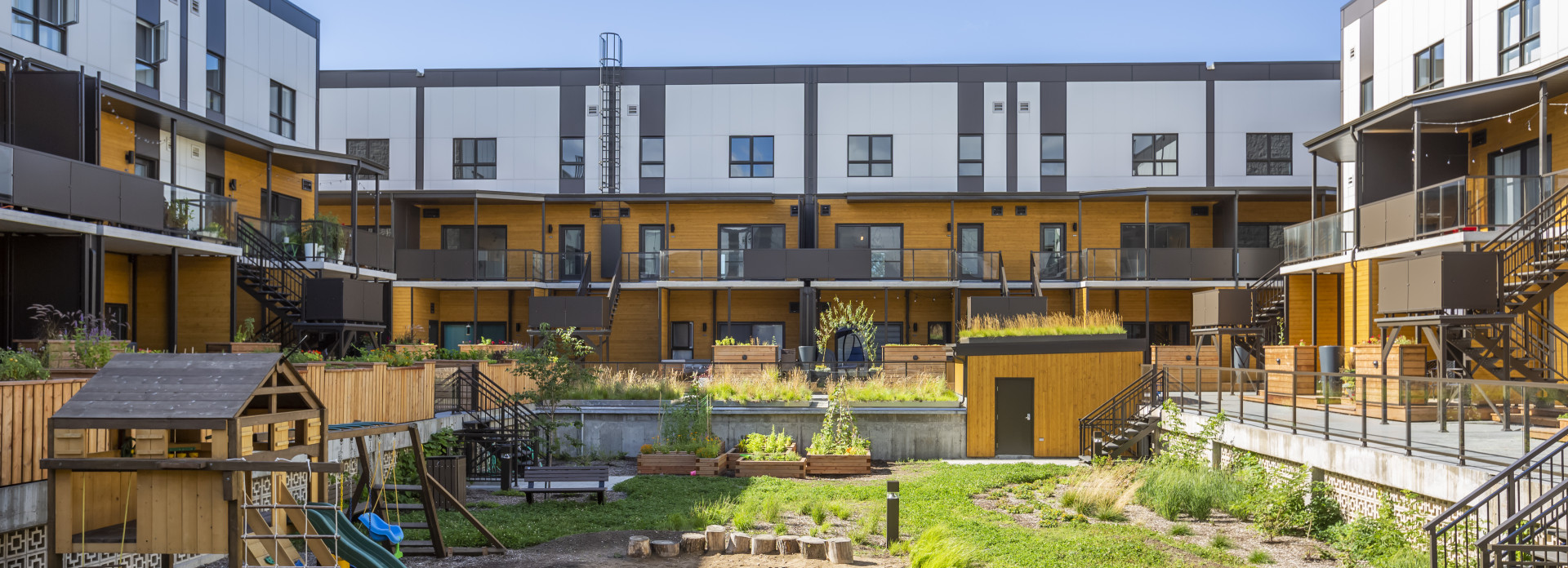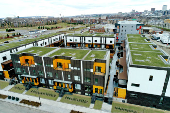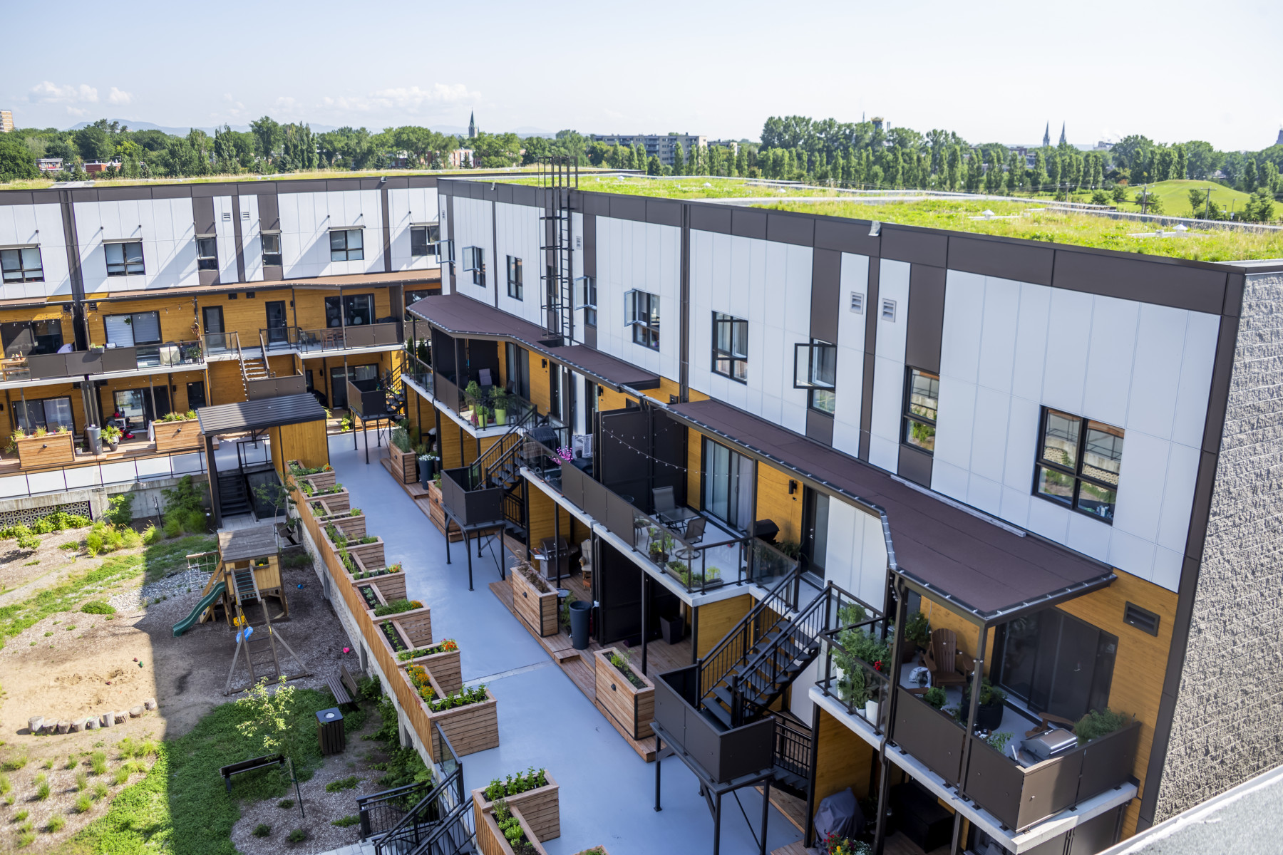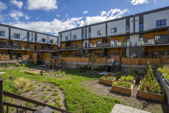 Les maisons de ville superposées de 2 étages s’organisent en 4 axes autour d’une belle cour aménagée munie d’un potager commun. Le confort des occupants et l’aspect pratique des installations (terrasse piétonne, rangements à vélos, stationnements couverts, cabanon commun) sont à l’honneur.