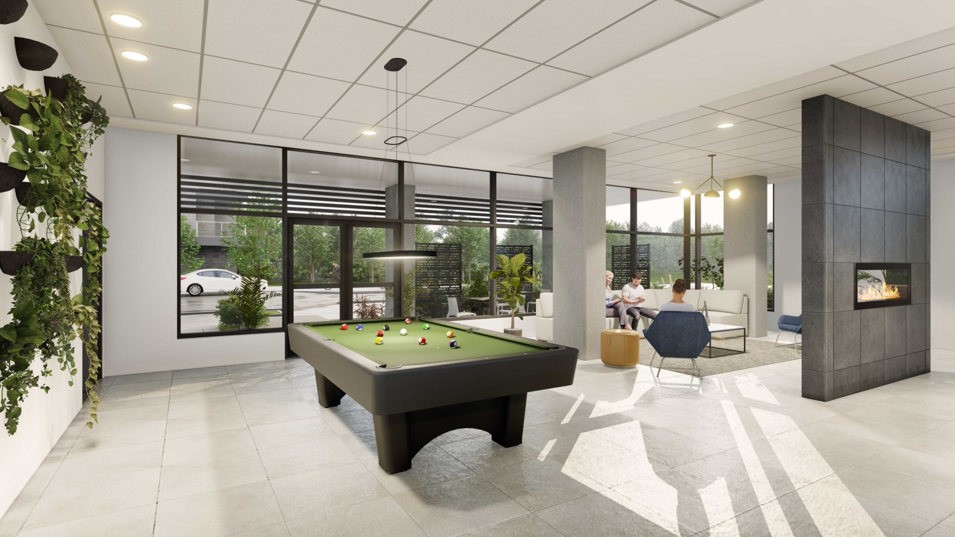 PHASE II : Une salle commune incluant un espace de travail collaboratif, un salon de détente avec foyer, une table de billard et un coin de jeux pour les enfants, ainsi qu’une salle de réception privée et un gym, incluant un espace dédié au yoga, seront aménagés.