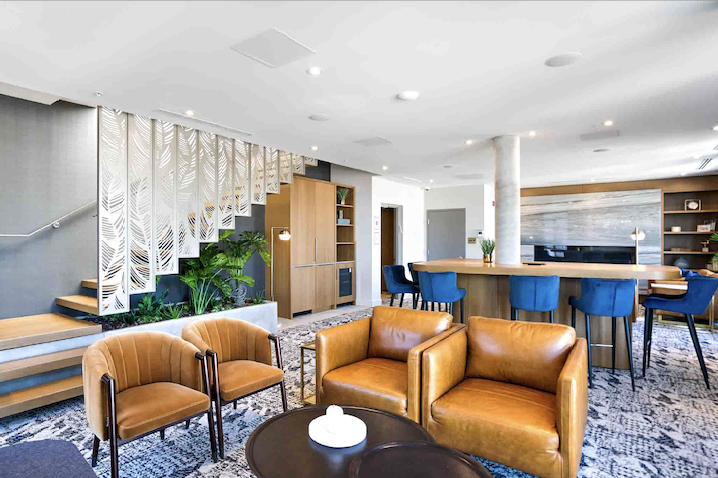 24/7 Lounge luxueux avec aire de travail, cuisinette et foyer.