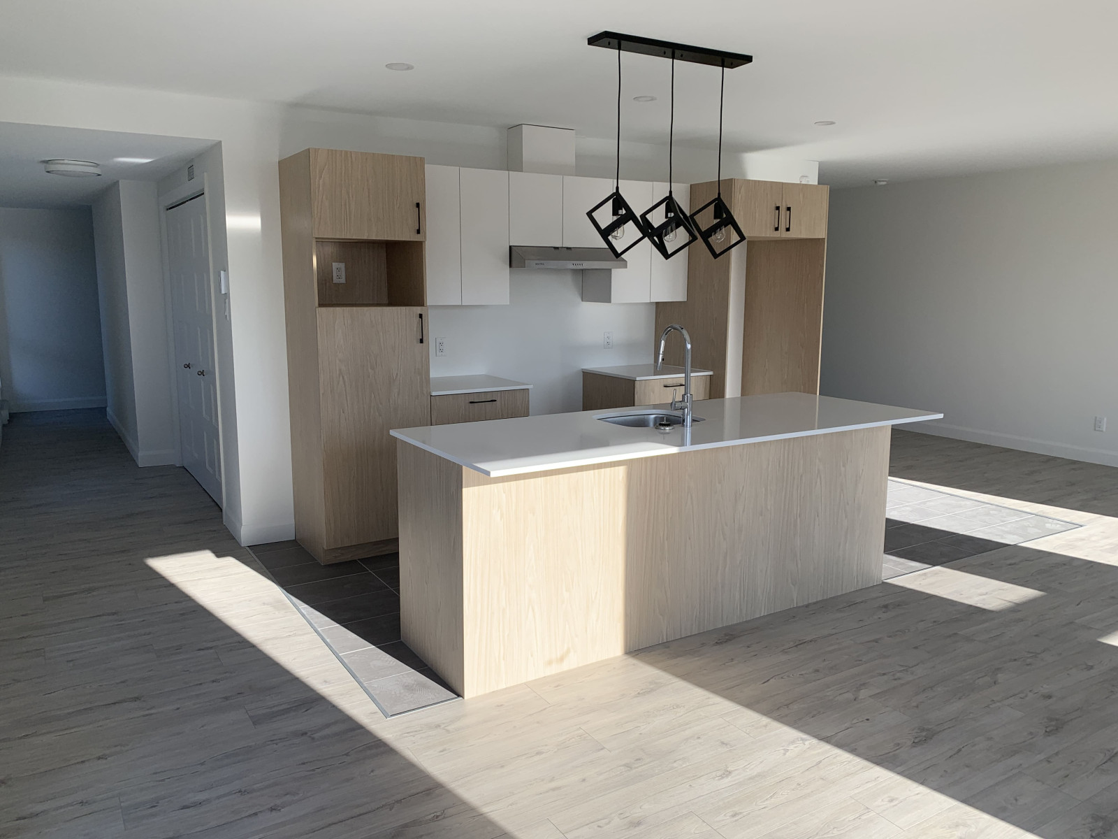 - Cuisine contemporaine de couleur blanche et bois naturel avec comptoirs de quartz blanc;